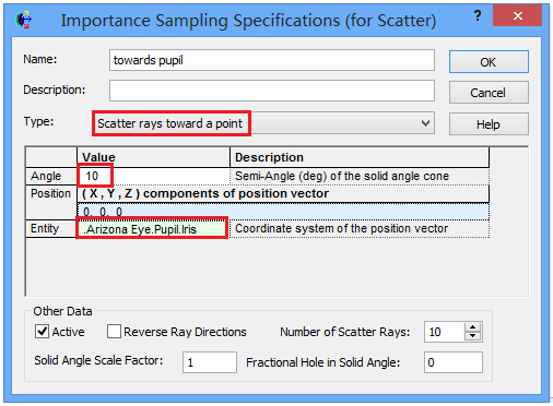 注意在视网膜的表面有散射重点采样规格定义,在“Scatter”标签的底部可获取该信息。“toward pupil”指定散射光朝向光瞳,半角度10度。