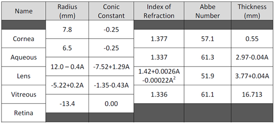 模型的定义如表1种所示,由半径、圆锥常数、折射率、阿贝数、到下一面的距离等一系列表面组成。一些参数由屈光度(A)来决定。