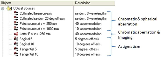 人眼光学模型可用来设计眼科用设备,光学系统注定了要与人眼一起使用。本文演示了这样一个模型:Arizona眼睛模型,在Jim Schwiegerling教授的书中有详细描述:《Field Guide to Visual and Ophthalmic Optics》。AZ眼睛模型达到了基于平均临床数据所决定的轴上和轴外像差等级。FRED文件包含了此眼睛模型及几个用来分析它的光源,并包括一个基于想要的屈光度来调整模型的内嵌脚本。
