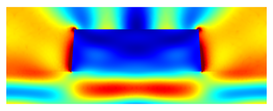 光栅被S和P偏振平面波照亮。JCMsuite计算近场分布。下图显示了当波长为193nm时,平面波从衬底侧垂直入射到结构内的近场强度。