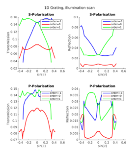 Matlab®脚本data_analysis/run_scan_illumination.m提供对入射角的扫描。它产生了以下图表,显示了反射和透射衍射级次的强度:
