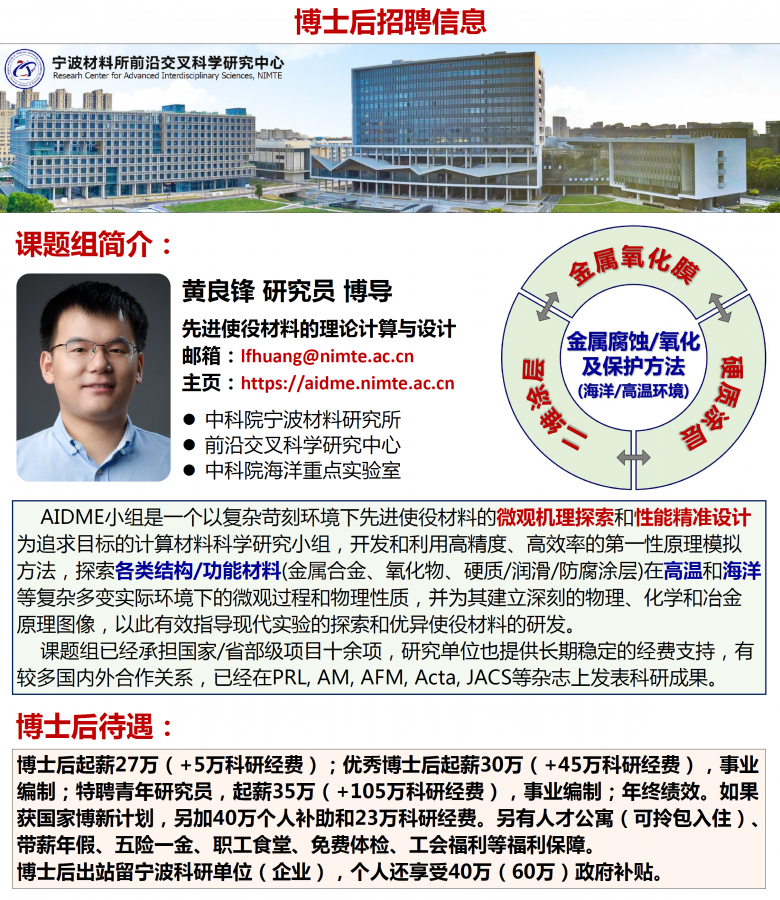课题组:先进使役材料的理论计算与设计 导师:黄良锋 研究员 博导 主页:https://aidme.nimte.ac.cn 单位:中科院宁波材料研究所 部门:前沿交叉科学研究中心,中科院海洋重点实验室 课题组简介: AIDME小组是一个以复杂苛刻环境下先进使役材料的微观机理探索和性能精准设计为追求目标的计算材料科学研究小组,开发和利用高精度、高效率的第一性原理模拟方法,探索各类结构/功能材料(金属合金、氧化物、硬质/润滑/防腐涂层)在高温和海洋等复杂多变实际环境下的微观过程和物理性质,并为其建立深刻的物理、化学和冶金原理图像,以此有效指导现代实验的探索和优异使役材料的研发。课题组已经承担国家/省部级项目十余项,研究单位也提供长期稳定的经费支持,有较广泛的国内外合作关系,已经在PRL, AM, AFM, Acta Mater, JACS等杂志上发表科研成果。 博士后待遇: 博士后起薪27万(+5万科研经费);优秀博士后起薪30万(+45万科研经费),事业编制;特聘青年研究员,起薪35万(+105万科研经费),事业编制;年终绩效。 如果获国家博新计划,另加40万个人补助和23万科研经费。 另有人才公寓(可拎包入住)、带薪年假、五险一金、职工食堂、免费体检、工会福利等福利保障。 博士后出站留宁波科研单位(企业),个人还享受40万(60万)政府补贴。 博士后招聘-黄良锋课题组.png [ Last edited by lfhuang on 2023-5-6 at 19:29 ] |
