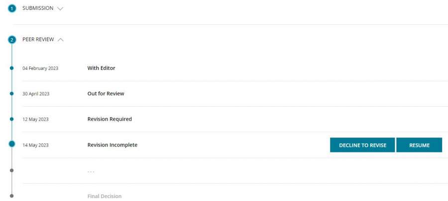 如图所示,我所期刊“mechanics based design of structures and machines”,经三个半月左右,于5月12号邮件收到“revision required”小修通知,但是当时期刊系统是登录不进去的,一般论文修改吧,至少也有半个月时间才对,我今早登录系统,5月14号状态变为“revision incomplete”!那图示“resume"是啥意思呢?是将修改稿重新提交,再重新送外审?又要重新来过?2 天时间修改,邮件也没明确给出时间截点!有没有大神遇到过这种情况,担心自己理解错误,先感谢了