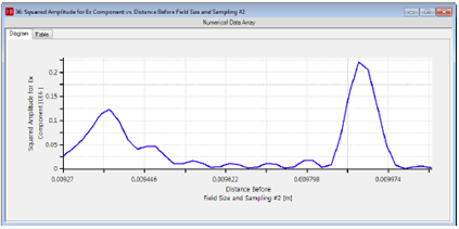 光轴上的光强分布可以用来检测焦点位置。光强越强说明聚焦效果越好。参数遍历(Parameter Run)文件“Scenario_16.01_Bifocal_Lens.run”中的变量为透镜与光轴上测量点间的距离。以下图示显示了光轴上的光强分布,横轴为测量点与透镜间的距离。