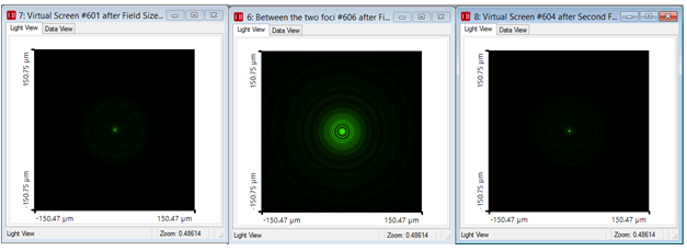 下图显示两焦点位置以及两焦点之间某位置上目标平面上的光场分布。