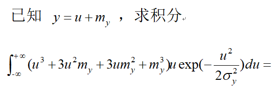 \!\( \*SubsuperscriptBox[\(\[Integral]\), \(-\[Infinity]\), \ \(\[Infinity]\)]\(\(( \*SuperscriptBox[\(u\), \(3\)] + 3 \*SuperscriptBox[\(u\), \(2\)]*\((y - u)\) + \*SuperscriptBox[\((y - u)\), \(3\)])\) u* \*SuperscriptBox[\(E\), \(( \*FractionBox[\(- \*SuperscriptBox[\(u\), \(2\)]\), \(2 \*SuperscriptBox[\(\[Sigma]\), \(2\)]\)])\)] \[DifferentialD]u\)\) |
