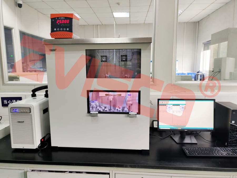 2、溶剂粘度的测定:卓祥全自动粘度仪设置到实验目标温度值并且稳定后,加入苯酚/1,1.2,2-四氯乙烷,软件中启动测试任务待结束。