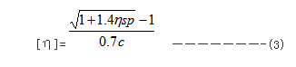 苯酚/1.1.2.2—四氯乙烷(质量比50:50)作溶剂的试验,按公式(1)、(2)、(3)计算相对黏度(ηr)、增比黏度(ηsp)和特性黏度([η]):