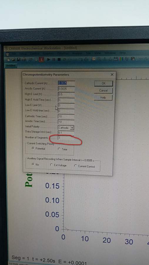 辰华电化学工作站CHI660E测计时电位法,(CP)chronopotentiometry,设置的3段,但是测到1段就停止了,怎么回事? 微信图片_20231023084404.jpg 微信图片_20231023084410.jpg |