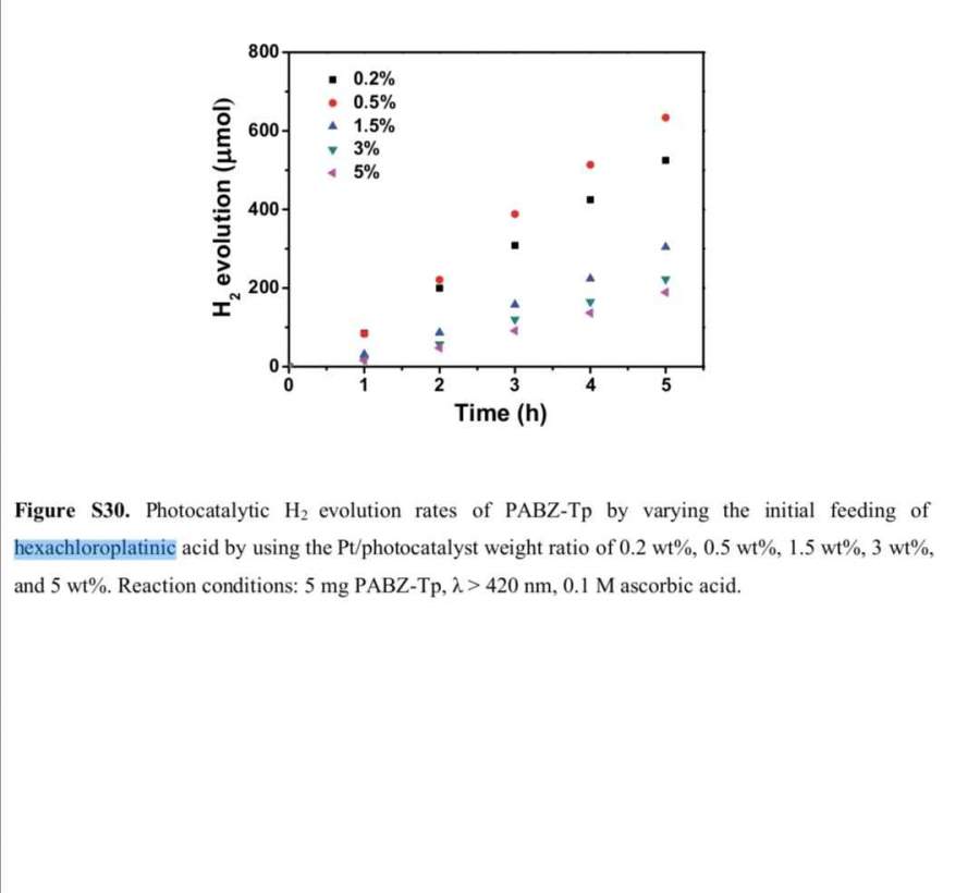 已知光催化剂是5mg,使用六氯铂酸作为Pt源,怎么计算能得到Pt在光催化剂上的负载量为0.2、0.5wt%还是其他的质量百分比?求求各位大佬解答。文献是Benzimidazole‐based covalent organic framework embedding single‐atom Pt sites for visible‐light‐driven photocatalytic hydrogen evolution这篇 发自小木虫Android客户端 |