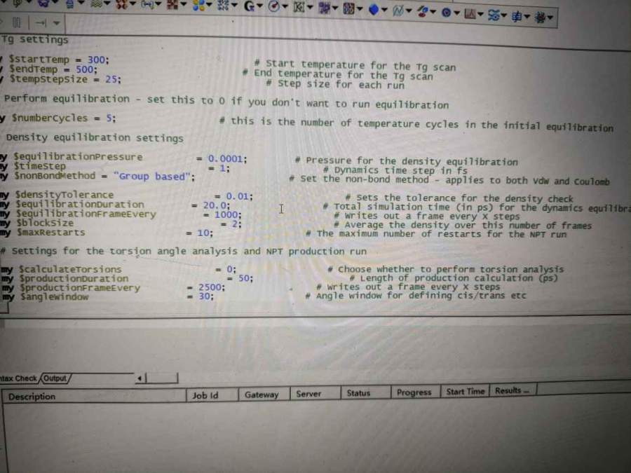 我建立了一个AC盒子,有5条高分子链,密度设置的是1.248,用脚本计算材料的玻璃化转变温度,能够成功运行,但是最后的输出结果里面没有数据,求助大佬看看是什么原因 @smutao @oxox6085 发自小木虫Android客户端 |