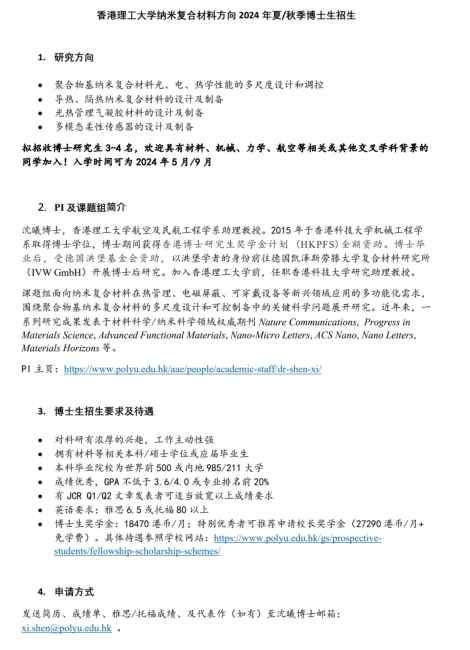 香港理工大学纳米复合材料方向2024年博士招生