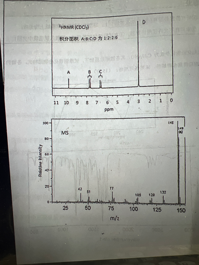 9-10为醛氢信号,6-8为苯环对位取代信号,B和C各代表2个氢,D为6个氢,两个甲基信号,初步推测为N上两个甲基,再经质谱分子量149核实为对二甲氨基苯甲醛 发自小木虫Android客户端 |
