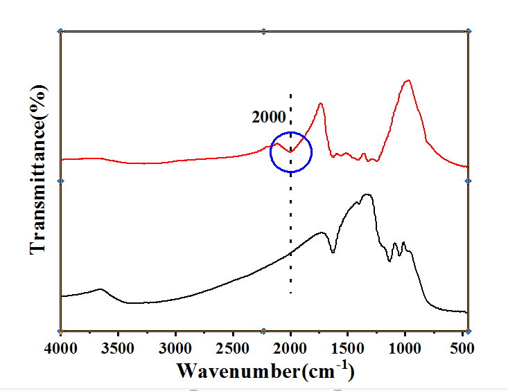 用有机氮源制备氮掺杂二氧化钛,其红外光谱图如图所示,红色曲线是掺杂二氧化钛,请问2000cm-1处的峰属于什么呢,我看许多掺氮文献中此处没有峰,请各位老师指导指导,谢谢
