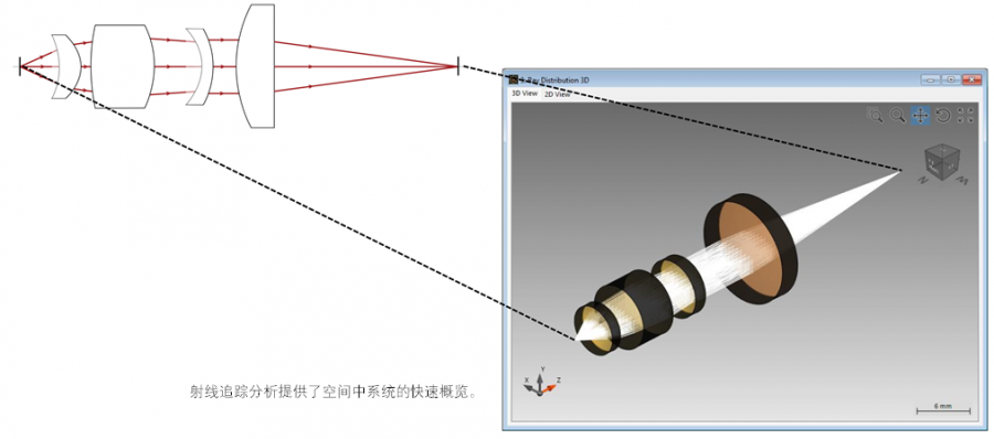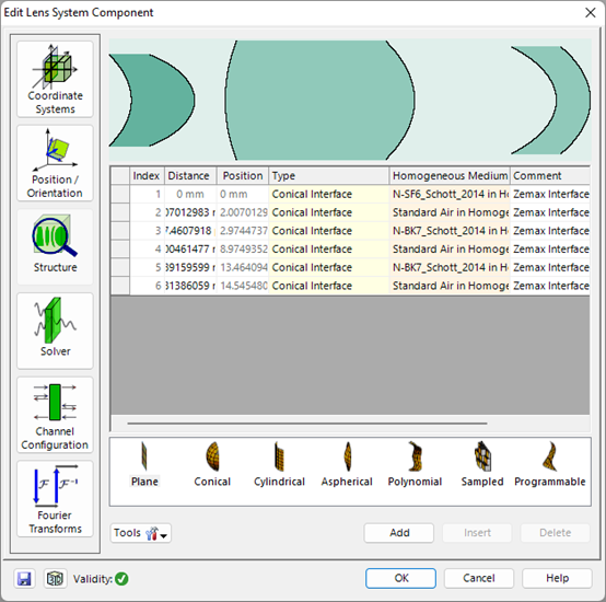 lens system component允许轻松定义一个由光滑表面和均匀、各向同性的介质交替排列组成的组件。在接口和材料方面,可以从内置的目录中选择现成的条目,也可以定制自己的条目,以获得最大的自由度。