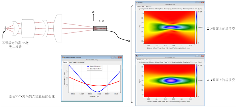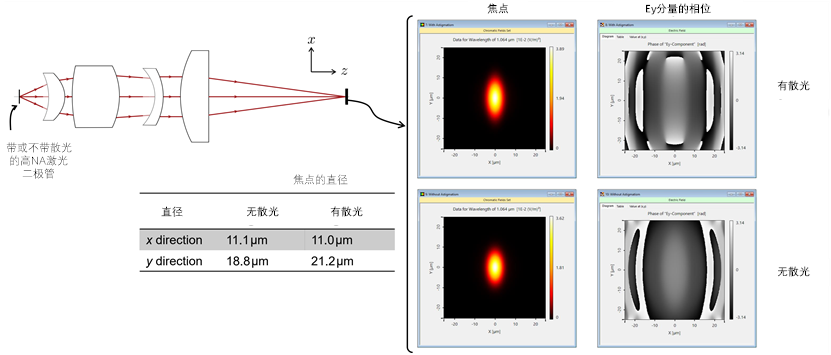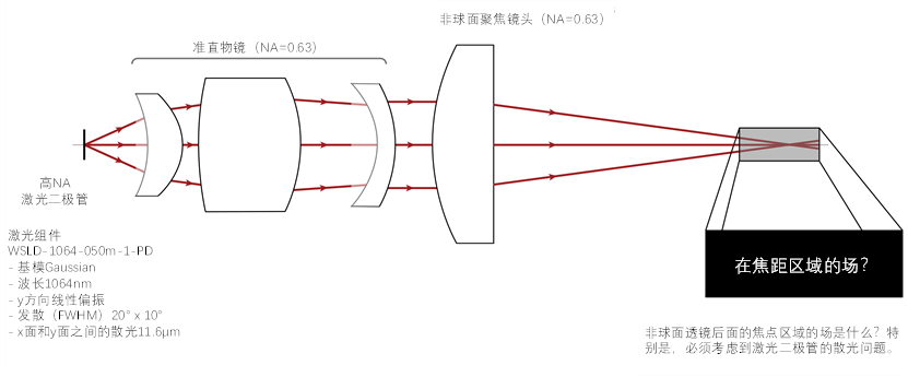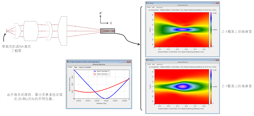 高功率激光二极管经常在两个方向上表现出不对称的发散和散光。此案例在virtuallab fusion中研究了激光二极管首先被物镜准直,然后被非球面透镜聚焦后焦点区域的场的演变。与没有散光的情况相比,散光对其焦点区域的场的影响被清楚地呈现出来。