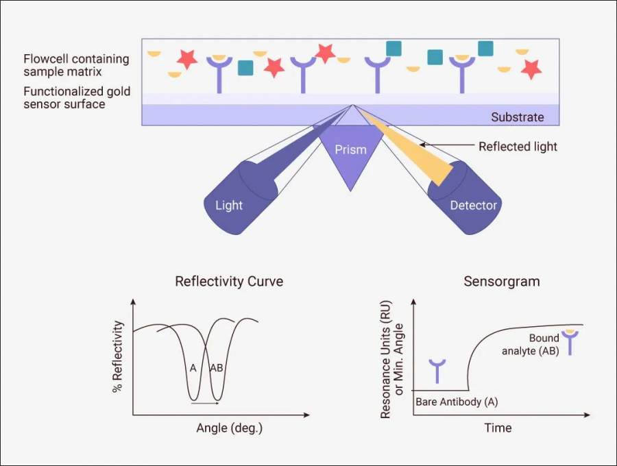 这种偏移可通过检测入射光的反射角度变化来实现。借助 spr 仪器的检测系统,可以实时、定量地测量共振角度的变化,从而得到亲和力相关信息。