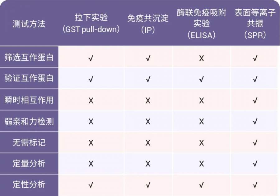 目前常用的检测分子间相互作用力的主流方法分为 4 种:表面等离子共振 (spr)、拉下实验 (gst pull-down)、免疫共沉淀 (ip)、酶联免疫吸附实验 (elisa)。其中,spr 技术是生命科学基础研究、药物研发与医学诊断分析领域动力学及亲和力分析的首选检测方法,也是检测生物分子相互作用的 “金标准”。