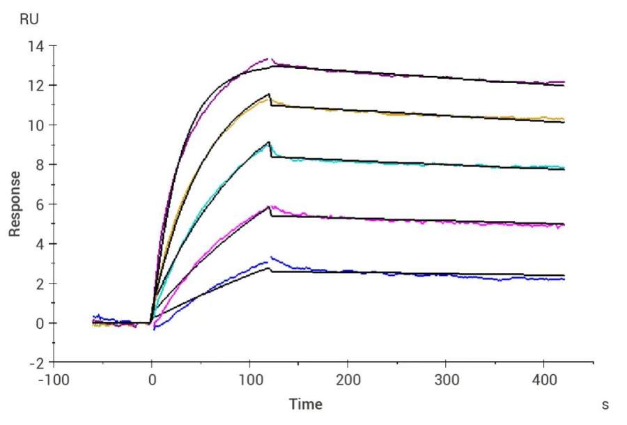 通过 spr 技术,使用 biacore 仪器测定不同浓度下 human tgfbr1 蛋白与 mature tgf beta 1 蛋白的亲和力。利用 t200 的分析软件,采用 1:1 binding 的分析模式对其结合和解离进行分析,其亲和力常数为 0.12 um。