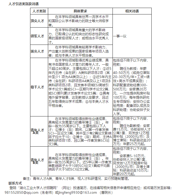 生命科学与健康工程学院2024年人才招聘公告 湖北工业大学生命科学与健康工程学院始建于1978年,具有悠久辉煌的学院办学历史。进入“十四五”发展时期以来,学院以建设“学术型学院”为发展目标,以建设“国家一流学科”为突破口,加快领军人才汇聚及自主培养,主动对接国家创新驱动发展战略,面向国家重大需求和国民经济主战场,聚焦“生命健康”前沿研究领域。学院积极推动生物、食品及医药相关重点学科快速发展,加快布局“生物医药”和“食品营养”等前沿研究方向,强化“多学科交叉”和“理工”融合,力争在生命与健康领域彰显学院重要影响力。学院秉承“厚德博学、求实创新”校训,积极探索生命健康创新人才培养体系,加快生命科学拔尖人才基地班(本-硕-博衔接)建设,培养具有国际化视野、综合素质高、创新能力强的高水平专业人才。 近年来,学院加快高水平师资队伍建设初见成效,通过引育并举不断优化师资结构,汇聚了一大批以美国、加拿大、英国、德国、日本等留学归国的中青年骨干教师。学院现有专任教师137人,博士生导师26人、硕士生导师125人。拥有欧洲自然科学院院士1人、加拿大皇家科学院院士1人、国家级高层次人才5人、海外高层归国专家3人、省级人才49人、湖北省自然基金创新群体2个、湖北省优秀中青年创新团队6个,学院教师获“全国优秀教师”、“湖北省优秀共产党员”、“湖北省青年五四奖章”、“湖北省先进工作者”、“湖北省编钟奖”等多项荣誉称号。 联系方式 登陆“湖北工业大学人才招聘网” (网址https://zhaopin.hbut.edu.cn)投递简历,在线填写相关信息并申请相应岗位;或将简历发至邮箱:981552850@qq.com(朱老师)或jingfeng9930@163.com (唐院长) 学院朱老师;027-59750483 人事处高层次人才办公室:027-59750186 生命科学与健康工程学院2024年人才招聘公告:https://sbef.hbut.edu.cn/info/1025/2630.htm 湖北工业大学2024年人才招聘公告:https://rs.hbut.edu.cn/info/1008/1184.htm 应聘者登陆“湖北工业大学人才招聘网” (网址https://zhaopin.hbut.edu.cn)投递简历,在线填写相关信息并申请相应岗位或直接联系学院招聘负责人,投递简历。 人才引进类别及待遇: 微信图片_20240222084741.png |