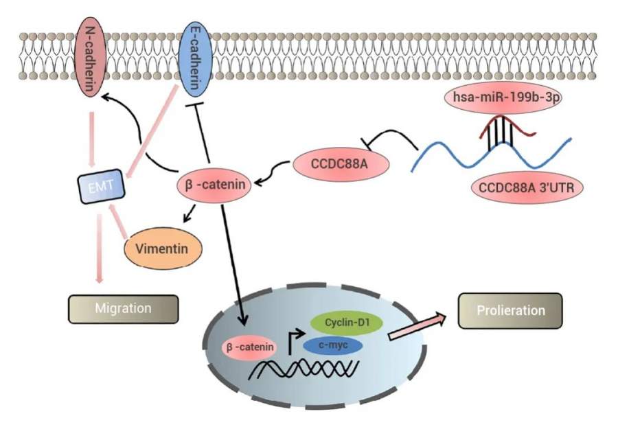 今年 8 月,Dongsheng Zhu 等人揭示了miR-199b-3p在骨肉瘤 (OS) 的形成和进展中发挥关键作用。miR-199b-3p 可与 CCDC88A 的 3' 非翻译区 (UTR) 结合,下调 CCDC88A 的表达水平,抑制 EMT 和 Wnt/β-catenin 信号通路,从而介导其对 OS 细胞增殖和侵袭的抑瘤作用[11]。