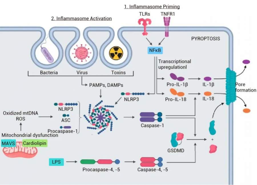 其次,细胞焦亡是一种炎症形式,其由促炎信号触发并与炎症相关[1],可经微生物感染或宿主因素引发,最常在细胞内细菌或病原体感染时发生[2]。它是由炎症小体的活化及炎症性半胱天冬酶 (Caspases) 的激活引起的(炎症小体往期回顾:炎症小体:免疫炎症领域热门选手)。