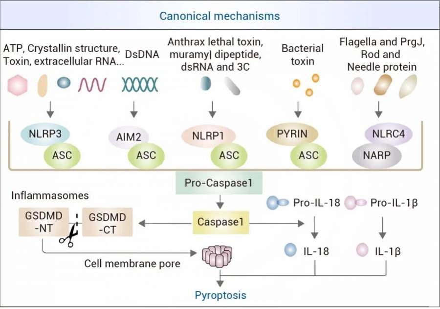 Caspase-1 是焦亡过程中最重要的 Caspases 家族成员,通过集结响应不同刺激的炎性传感因子,构建出了专属 Caspase-1 经典通路战舰群:NLRP3 炎性体、AIM2 炎性体、NLRP1 炎性体、PYRIN 炎性体,以及 NLRC4 炎性体。
