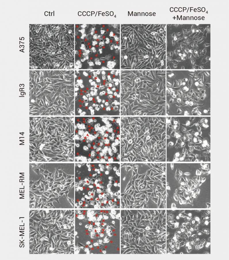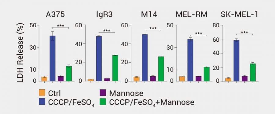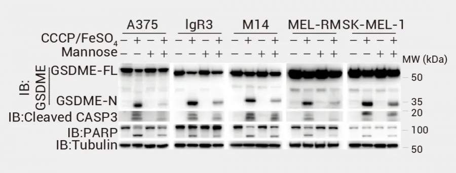 近期发表的文献 "Mannose antagonizes GSDME-mediated pyroptosis through AMPK activated by metabolite GlcNAc-6P" 表明,CCCP (Carbonyl cyanide m-chlorophenyl hydrazine) 加铁可诱导黑色素瘤细胞中 GSDME 依赖性细胞焦亡,而甘露糖可逆转不同癌细胞系中 GSDME 介导的细胞焦亡[17]。