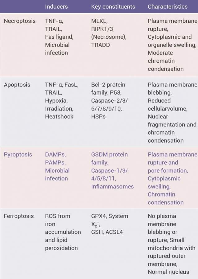 图 1. 细胞焦亡与其他细胞程序性死亡的特征[3]。