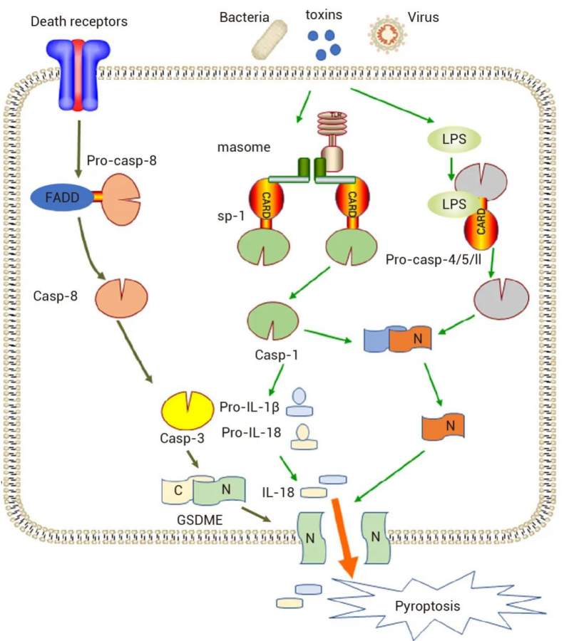 在上一个单元故事中早早露面的 Caspase-3 并不神秘。它主要与细胞凋亡过程有关,而近年来,人们发现了 Caspase-3 的另一个作用,它可以位于 GSDME 的上游,在焦亡中发挥炎症切割作用[12]。