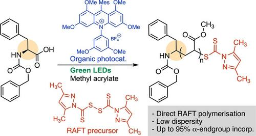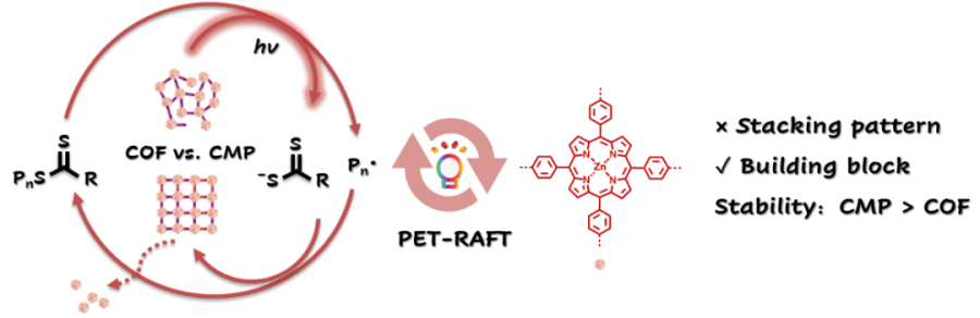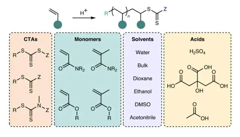 简介:可逆失活自由基聚合方法,如原子转移自由基聚合(ATRP)、氮氧化物介导聚合和可逆加成-断裂链转移(RAFT)聚合,使合成具有可控分子量、分散性和结构的定制聚合物成为可能。其中,RAFT是最通用的一种,因为它能够聚合广泛的单体类别,因此它已被广泛用于生成各种各样的材料。 机理:在RAFT反应中,通常加入双硫酯衍生物SC(Z)S—R作为链转移试剂。聚合中它与增长链自由基Pn·形成休眠的中间体(SC(Z)S—Pn),限制了增长链自由基之间的不可逆双基终止副反应,使聚合反应得以有效控制。这种休眠的中间体可自身裂解,从对应的硫原子上再释放出新的活性自由基R·,结合单体形成增长链,加成或断裂的速率要比链增长的速率快得多,双硫酯衍生物在活性自由基与休眠自由基之间迅速转移,使分子量分布变窄,从而使聚合体现可控/“活性”特征。 图1 RAFT试剂分子的工作原理 光诱导电子转移可逆加成-断裂链转移(PET-RAFT)聚合具有单体适用性广,易于表面制备,有些体系无需除氧操作等优势。尽管均相PET-RAFT光催化剂得到了广泛的研究,但存在稳定性有限,无法循环使用等的问题。因此,发展用于聚合的异相光催化剂受到关注。 基于以上,北京大学马玉国教授课题组利用(金属)卟啉在PET-RAFT聚合的优势,设计了异相共价有机框架(COF)和共轭微孔聚合物(CMP)光催化剂用于PET-RAFT聚合。这些光催化剂可以高效地将电子转移到链转移剂制备得到具有窄分子量分布(<1.20)和高链端保真度的聚丙烯酰胺和聚丙烯酸酯,聚合速率高于具有相似构建单元的卟啉或镍卟啉光催化体系. 同时,通过对比锌卟啉COF和CMP催化剂的结构性质和催化聚合的效果,探究了异相光催化剂在聚合中的作用机理、设计要素和稳定性(图2)。 图2.锌卟啉COF和CMP光催化剂PET-RAFT聚合的设计、机理及要素。DOI:10.11777/j.issn1000-3304.2023.23134 聚合结果显示,在催化剂负载量为2.5mg/mL时,COF和CMP光催化N,N-二甲基丙烯酰胺的表观聚合速率常数分别为0.0522h-1和0.0621h-1,聚合物的理论和实际分子量符合较好,且分子量分布窄,开关光源的过程能够有效控制聚合的开始和停止,原位扩链实验证明了链末端的高保真度。结合动态淬灭实验和固体电子顺磁共振谱等表征方法,探究了光催化剂催化可控聚合过程的机理。 此外,相比于COF,CMP光催化剂具有更高的化学稳定性,可以被有效分离并循环使用. 这项工作阐明了多孔有机聚合物在光控聚合中的设计要素,为实现异相的光聚合提供重要借鉴。 可逆加成-断裂链转移(RAFT)聚合是有效的受控自由基聚合方法之一,因为它具有广泛的材料范围和对各种官能团和杂质的高耐受性。然而,为了操作RAFT聚合,需要恒定的自由基供应,通常通过外源性热自由基引发剂,这些引发剂不仅难以运输和储存,而且主要导致末端和端基的不均匀性。 消除热自由基引发剂的使用不仅有利于提高合成聚合物的质量,而且有利于克服运输和储存问题。为此,来自苏黎世联邦理工学院的Athina Anastasaki教授团队提出了一种由酸触发RAFT聚合的方法,该方法在黑暗中操作,并且不需要使用任何传统的自由基引发剂。 图3.来自DOI:10.1038/s44160-023-00462-9 丰富的酸(例如硫酸)具有引发和加速聚合的双重作用。作者制备的聚合物具有低分散性。该方法与多种乙烯基单体和溶剂相容,可应用于控制良好的高分子量嵌段共聚物的合成以及自由基聚合,且操作简单,实用性广泛,将成为传统热RAFT和FRP的强大替代品。 小分子和大分子基质的聚合物的受控接枝是许多先进聚合物应用的重要过程。这通常需要用适当的官能团对底物进行预官能化,例如RAFT剂或ATRP引发剂,这需要额外的合成步骤。 近日,蒙纳士大学Joel F. Hooper课题组通过羧酸的自由基脱羧反应,从小分子和聚合物基质中可控地接枝丙烯酸酯和丙烯酰胺聚合物。通过羧酸的自由基脱羧反应,实现了小分子和聚合物基质中丙烯酸酯和丙烯酰胺聚合物的受控接枝。此方法可以高效合成有优异分散性的聚合物,只需一步就能得到高度官能化的聚合物,避免了多步官能化和多步聚合过程。 图4.来自DOI:10.1002/ange.202317071 其中,羧酸在光催化作用下脱羧生成烷基自由基,与烯烃单体发生连续自由基加成,经二硫代甲酸酯自由基淬灭生成聚合物。该方法利用基材中存在的固有官能团,在一步中实现有效的聚合物引发,同时对分子量和分散性进行出色的控制。此外,在开关实验证明在无光照时没有发生聚合,表明该反应是光-RAFT机制。 |