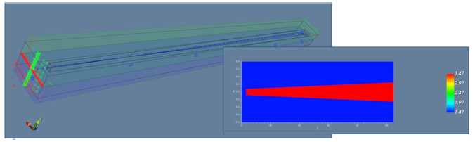 要模拟的关键部件是来自参考文献[1]的线性锥形硅波导(160 nm至500 nm宽度变化超过100 um长度,250 nm高度),它埋在二氧化硅波导中(注意:使用的尺寸减小了(1.5 umx1.5 umx105 um),以便达到更快的模拟时间)
