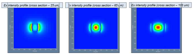 底部视图显示了不同位置的模式转换(左:25 um,中间:65 um,右:103 um)