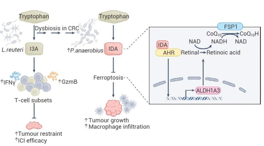 罗伊氏乳杆菌 (L. reuteri) 释放色氨酸代谢物吲哚衍生物 I3A (Indole-3-aldehvde)。促进产生 IFNγ (干扰素 γ) 和 GzmB (表达颗粒酶 B) 的 CD8+ T 细胞,从而增强免疫检查点抑制剂 (ICI) 效果。色氨酸衍生物 IDA 源自 P. angerobius,通过抑制铁死亡促进 CRC 的发展。IDA 是 AHR 的内源性配体,直接调节基因 ALDHIA3。然后,该酶产生 NADH,并通过 NADH 介导的 CoQ 还原来促进 FSPI 调节的抗铁死亡。