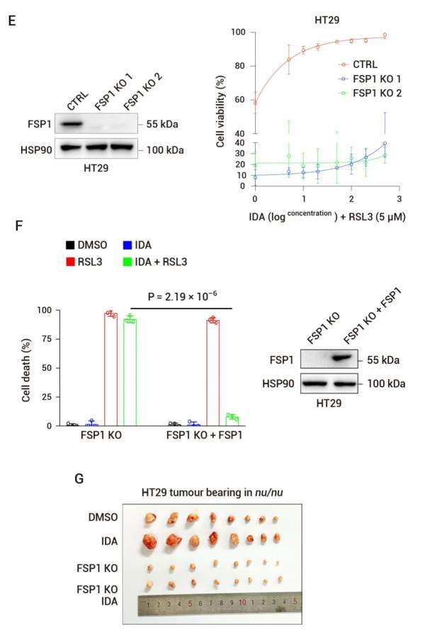 FSP1 (Ferroptosis-suppressor protein 1) 可利用 NAD(P)H 催化还原性辅酶 CoQ10 的产生,作为细胞质膜蛋白保护细胞免于铁死亡。因此,构建 FSP1 KO 的 HT29 和 HT1080 细胞,以验证 FSP1 是否有助于 IDA 调节的铁死亡。