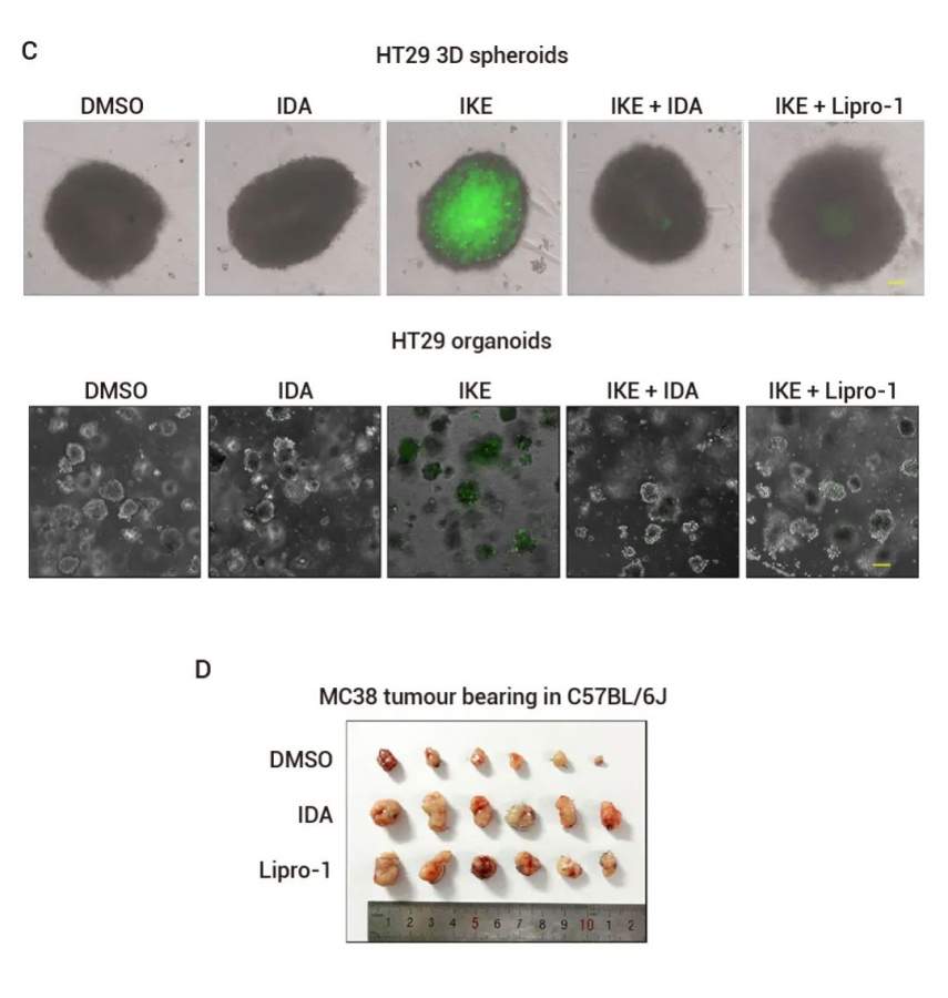 同时,在 HT29 3D 肿瘤球体和类器官中也观察到类似的结果:IDA 或 Liproxstatin-1 (Lipro-1)在很大程度上抑制了 RSL3 或 IKE (imidazole ketone erastin) 诱导的 HT29 肿瘤球体的铁死亡 (图 2C)。此外,通过异种移植模型,IDA 显著消除了脂质过氧化并促进了肿瘤的发展。其在 C57BL/6J 小鼠中也显示出对铁死亡的强大抑制作用,并促进 MC38 异种移植的进展 (图 2D)。