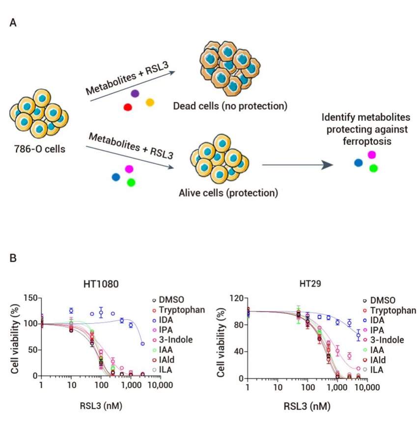(A) 筛选方法示意图;(B) 用 RSL3 和 50 μM 色氨酸代谢物 (Tryptophan、IDA、IPA、3-Indole、IAA、IAld 和 ILA) 处理 24 小时的 HT1080 细胞或 HT29 人结肠癌细胞的细胞活力;(C) HT29 三维肿瘤球体和类器官的代表性图像,用 IKE (10 μM)、IDA (100 μM) 和 Lipro-1 (1 μM) 处理48小时;(D) C57BL/6J 小鼠中 MC38 荷瘤分析。