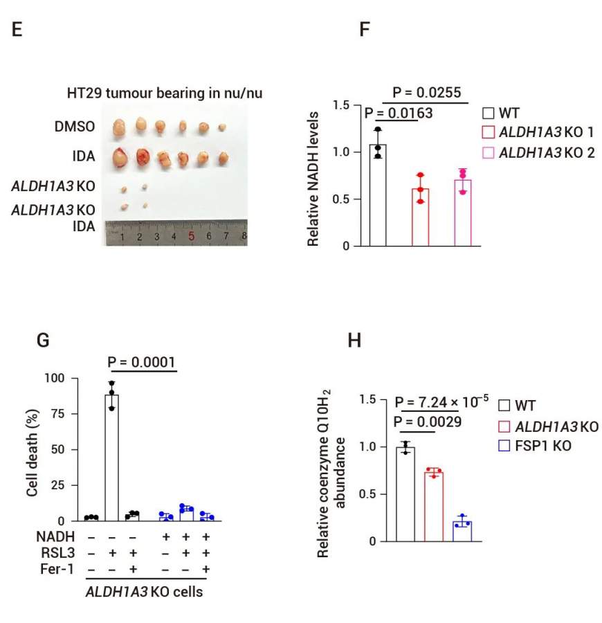 体外实验表明纯化的 ALDH1A3 可以通过视黄醛产生 NADH。ALDH1A3 缺失显著降低了 NADH 水平,而在 ALDH1A3 KO 细胞中补充 NADH 可恢复铁死亡 (图4F-G)。在 ALDH1A3−/−。和 FSP1−/−细胞中还检测到较低比例的还原为氧化的CoQ10 (图 4H)。总之,这些数据表明 ALDH1A3 对于 IDA-AHR-FSP1-CoQ10 介导的铁死亡抑制至关重要。