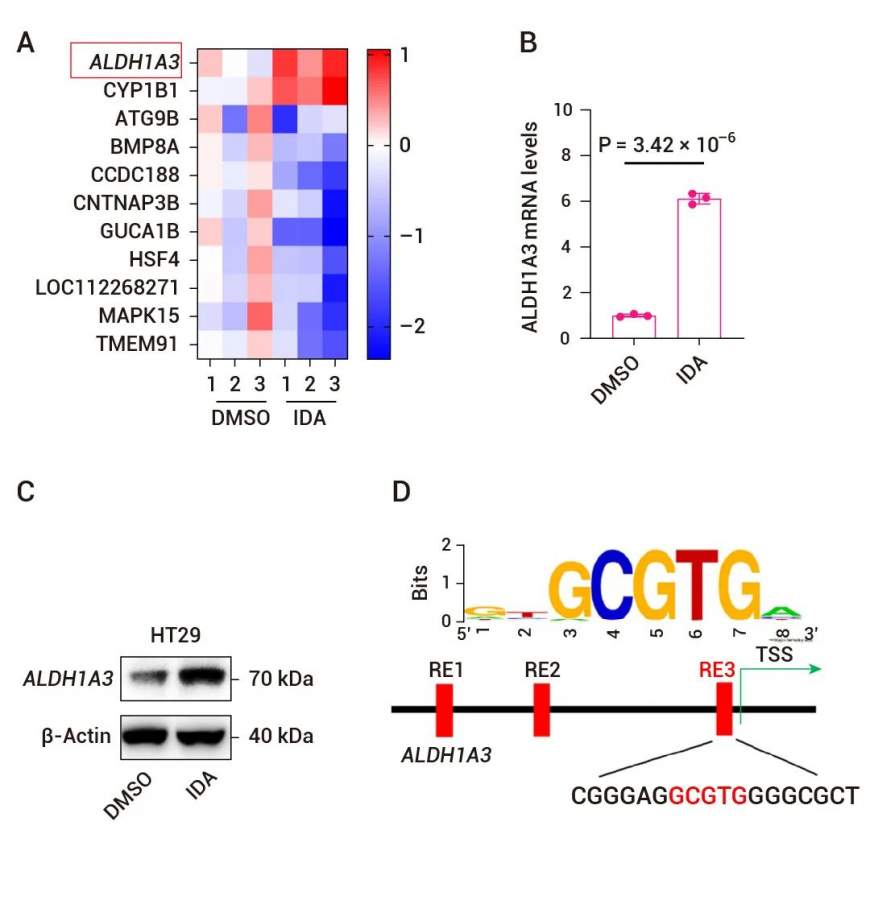 (A-C) HT29 细胞中 IDA (50 μM) 处理可能调节的 12 个主要基因的热图 (A),处理后 ALDH1A3 的相对 mRNA 水平 (B) 和 ALDH1A3 表达的蛋白质印迹分析 (C)。(D) 每天 IDA (50 mg/kg) 的 nu/nu 小鼠中 HT29 WT 和 ALDH1A3 KO 异种移植物的肿瘤图像。(E) 人类 ALDH1A3 基因启动子区域的示意图,存在三个潜在的结合区 (R1-R3),其中 R3 包含相同的序列。(F) 通过酶测定在 HT29 WT 和 ALDH1A3 KO 细胞中测量的 NADH 水平。(G) 补充 DMSO 或 NADH (10 μM) 后,用 RSL3 (5 μM) 处理的 HT29 ALDH1A3 KO 细胞死亡。(H) HT29 WT、ALDH1A3 KO 和 FSP1 KO 细胞中还原 CoQ10 与氧化 CoQ10 的相对比率。