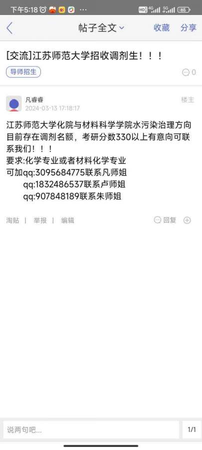 江苏师范大学化学与材料科学学院贾文林课题组目前存在调剂名额,有意向可向qq:3095384775发简历联系 发自小木虫Android客户端 |
