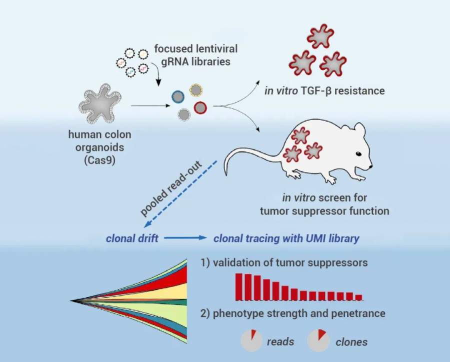 为了促进肿瘤驱动因素的高通量基因测试和功能鉴定,Michels BE 等人开发了一个在人类结肠类器官中进行 CRISPR-Cas9 联合筛选的平台,使得利用类器官进行体外和体内移植后肿瘤抑制基因的筛选鉴定成为可能[2]。