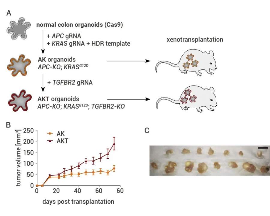 (A) 实验设置。致瘤前类器官系(AK:APC-KO 和 KRASG12D)和皮下移植后致瘤系(AKT:额外 TGFBR2 -KO)。(B) NSG 小鼠(n = 7 和 8 只小鼠)中移植 AK 和 AKT 类器官后肿瘤体积 (±SEM) 的测量。(C) AK(上排)和 AKT 类器官(下排)移植后的肿瘤形态。
