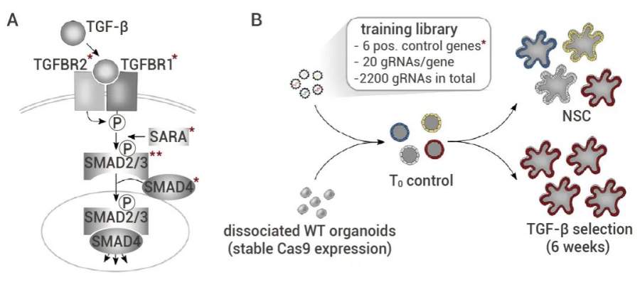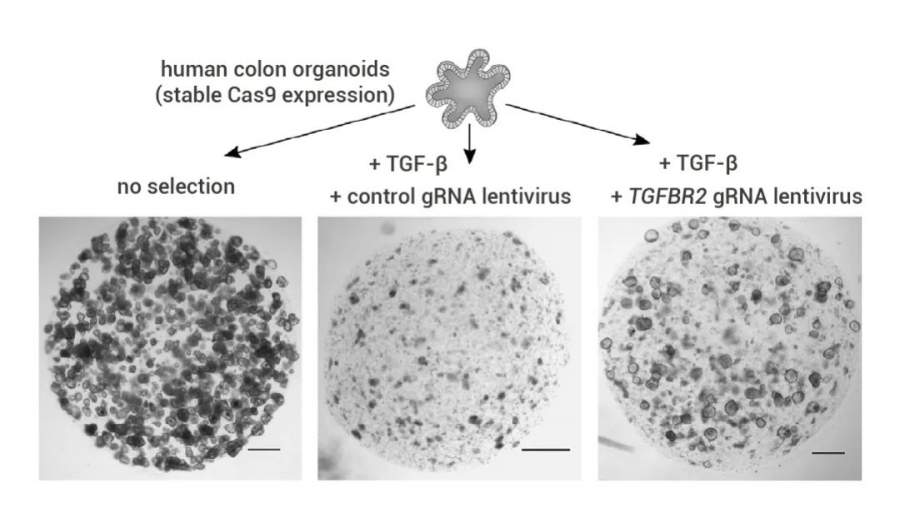 首先,作者通过药筛系统将携带 Cas9 蛋白的慢病毒载体转入结肠类器官,建立了稳定表达 Cas9 的人结肠类器官培养体系。正常人结肠类器官对转化生长因子-β (TGF-β) 敏感,在培养体系中添加 TGF-β 可以有效杀死类器官,而敲除 TGF-B 的受体基因 (TGFBR) ,即用针对 TGFBR2 的慢病毒 gRNA 转导则可以挽救 TGF-β 导致的细胞毒性。