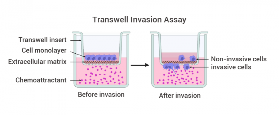 在肿瘤相关研究中,利用 transwell 小室检测肿瘤细胞的迁移和侵袭能力十分常见。在 transwell 小室的聚碳酸酯膜上侧铺一层基质胶模拟细胞外基质,肿瘤细胞分泌基质金属蛋白酶消化基质进入下室,最后计算下室的细胞量即可反映细胞的侵袭能力。
