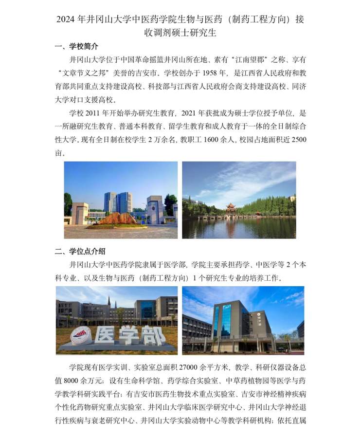 井冈山大学中医药学院生物与医药(制药工程方向)086002接收调剂硕士研究生