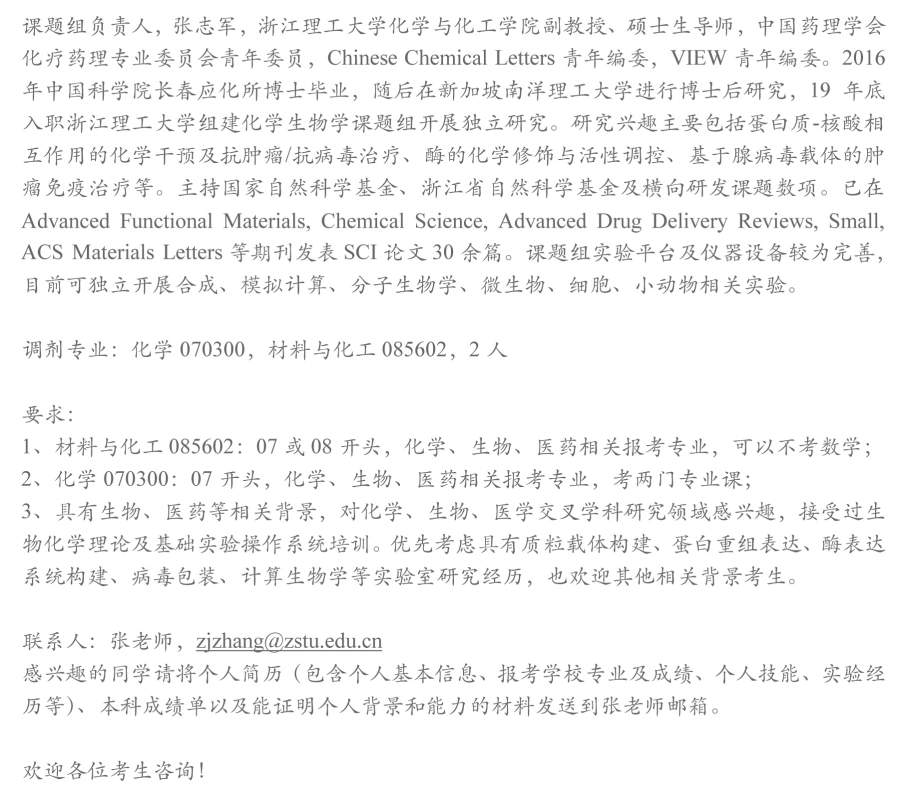 调剂专业:化学070300,材料与化工085602,1人 要求: 1、材料与化工085602:07或08开头,化学、生物、医药相关报考专业,可以不考数学; 2、化学070300:07开头,化学、生物、医药相关报考专业,考两门专业课; 3、具有生物、医药等相关背景,对化学、生物、医学交叉学科研究领域感兴趣,接受过生物化学理论及基础实验操作系统培训。优先考虑具有质粒载体构建、蛋白重组表达、酶表达系统构建、病毒包装、计算生物学等实验室研究经历,也欢迎其他相关背景考生。 联系人:张老师,zjzhang@zstu.edu.cn 感兴趣的同学请将个人简历(包含个人基本信息、报考学校专业及成绩、个人技能、实验经历等)、本科成绩单以及能证明个人背景和能力的材料发送到张老师邮箱。 课题组情况请查看图片 欢迎各位考生咨询! 浙江理工大学化学生物学课题组接收生物.jpg [ Last edited by jiliu482 on 2024-4-4 at 22:12 ] |