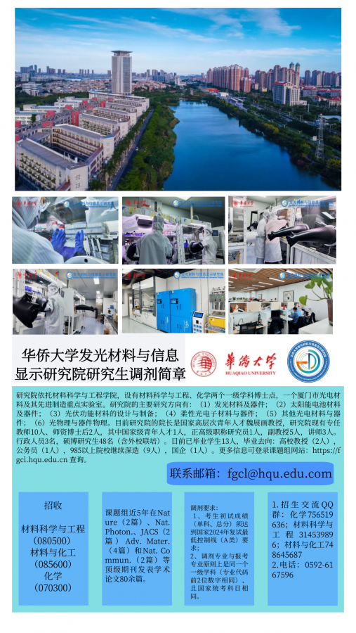 有意向的同学请联系: fgcl@hqu.edu.cn 要求:1.专业课中有数一或数二 2.材料、化学专业优先 3.调剂信息详情参见研究院官网(https://fgcl.hqu.edu.cn/) 实验室科研条件完备,科研气氛浓厚,奖学金、补助丰厚。 要求对自然科学有浓厚兴趣,追求个人成长,录用的学生可接收系统的高水平科研训练。 仅以毕业为目的者请勿打扰。 补充内容 华侨大学发光材料与信息显示研究院现招收材料科学与工程(0805)和材料与化工(0856)方向硕士调剂,如感兴趣请发送简历和个人信息到 fgcl@hqu.edu.cn。研究院目前累积到账经费逾千万元,在nature(2篇)、nature photonics、nature communications等高水平期刊发表论文100余篇,具有较强的师资和良好的办公环境和实验条件,毕业生前往复旦大学、华南理工大学等高校继续深造,就业前景广泛。同时,研究院还组织定期的团建和出游。研究院具体信息和调剂信息请见官网(https://fgcl.hqu.edu.cn/) 宣传手册 https://fgcl.hqu.edu.cn/ 实验大楼 [ Last edited by 百灵童 on 2024-4-3 at 17:35 ] |
