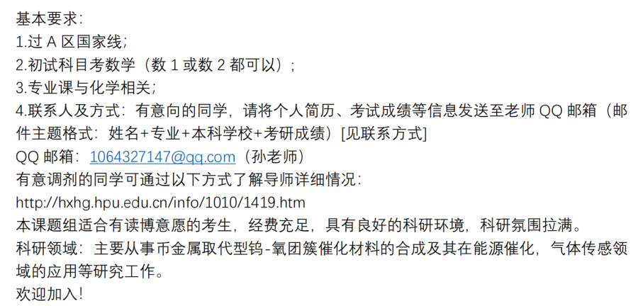 河南理工大学化学化工学院接收调剂研究生2名