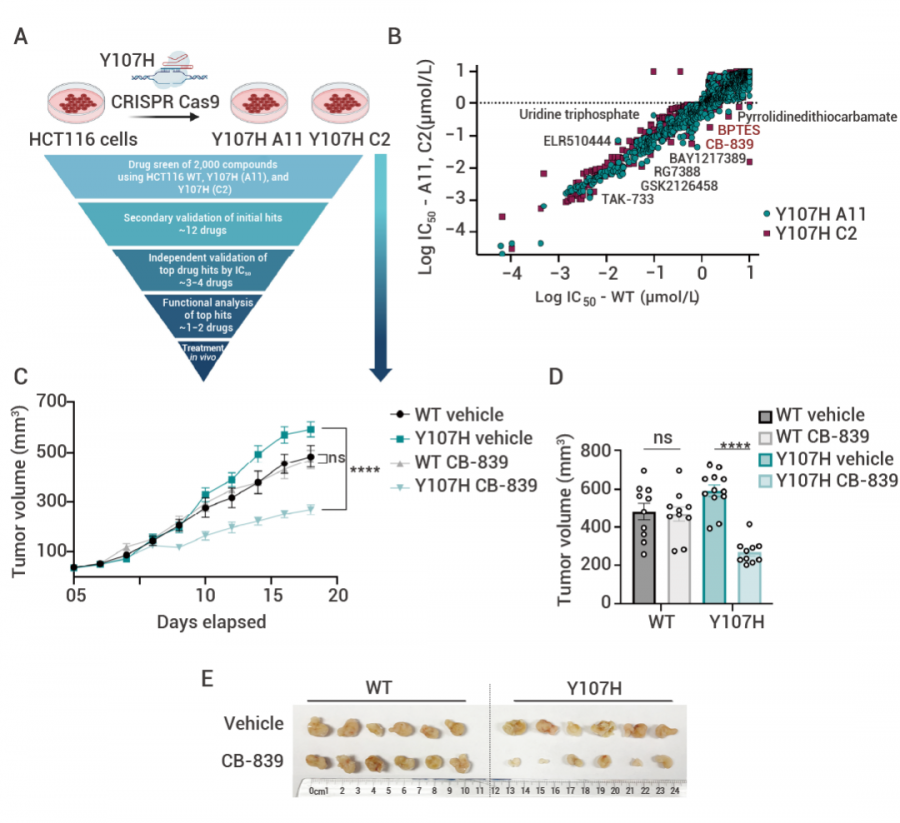 作者鉴定到的了大约 24 种化合物,在两个 Y107H 克隆中与亲本相比,IC50 降低了 3 倍 (图 4B),其中 CB-839 (HY-12248) 和 BPTES 两种化合物是谷氨酰胺酶抑制剂。随后作者选择了 CB-839 进行了进一步的体内抗肿瘤活性筛查。NSG 小鼠皮下注射 WT 或 Y107H HCT116 细胞并测量肿瘤生长情况,当肿瘤大小达到约 50 mm3时,每天两次灌胃 200 mg/kg 对照组或 CB-839 治疗组,结果显示 Y107H 肿瘤比 WT 肿瘤长得更大,亲代 HCT116 肿瘤在 CB-839 处理后没有显示出抗肿瘤作用,而 Y107H 肿瘤在 CB-839 处理组中生长显著减少 (图 5C-E)。