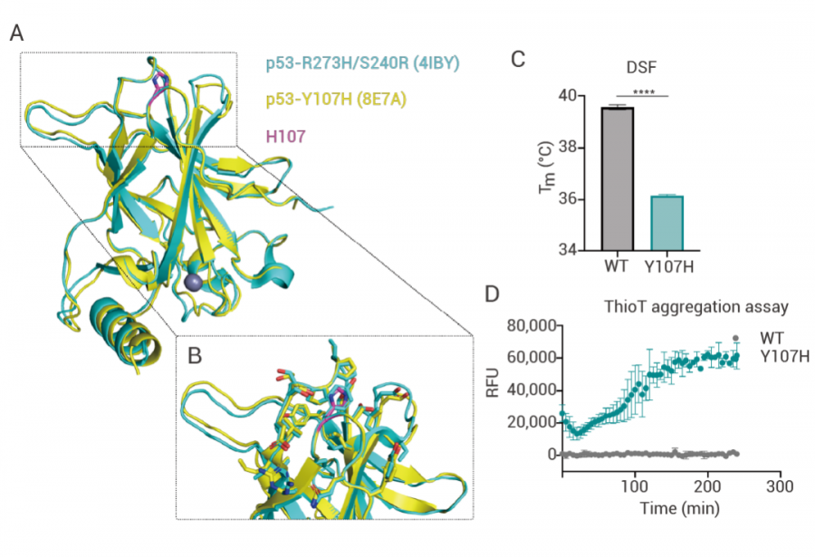 (A) Y107H 的晶体结构。p53 Y107H (黄色) 与 p53 R273H/S240R(青色)的叠加。Y107H 突变以洋红色显示。Zn2+ 被绘制为灰色球体。(B) p53 Y107H 结构中 H107(洋红色)的插图。(C) 通过 DSF 测量,Y107H 突变在热力学上使核心结构域不稳定。(D) 40°C 下观察 WT 和 Y107H 核心结构域的聚集动力学。